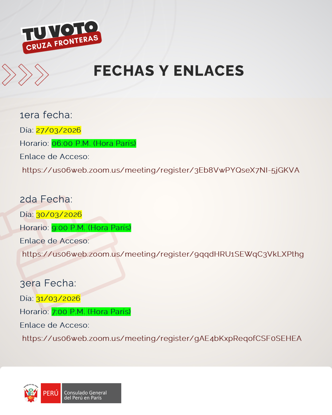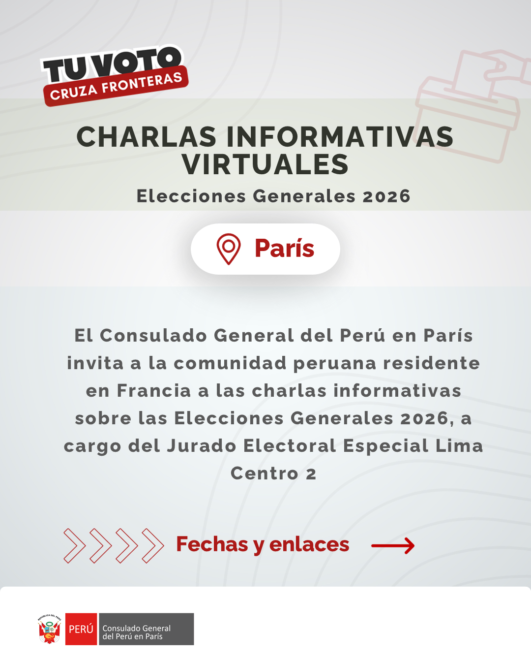 El Consulado General del Perú en París invita a la comunidad peruana residente en Francia a las charlas informativas en formato virtual sobre las Elecciones Generales 2026, a cargo del Jurado Electoral Especial Lima Centro 2.
