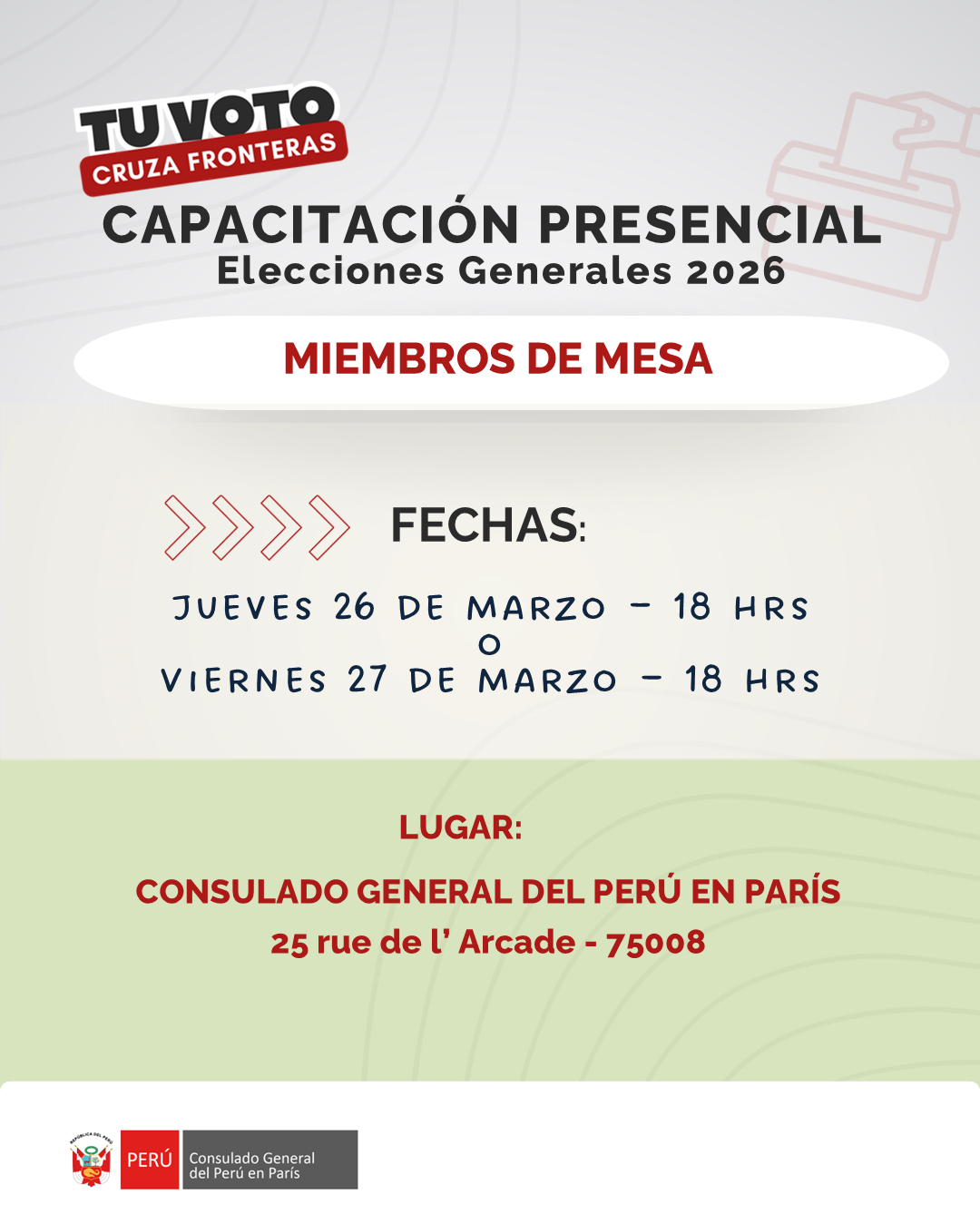 El Consulado General del Perú en París invita a los miembros de mesa de la sede París a la capacitación presencial con motivo de las Elecciones Generales 2026 (domingo 12 de abril 2026).