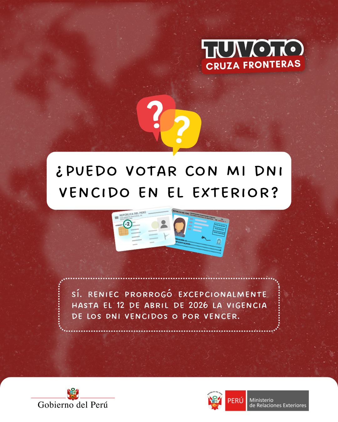 Mediante la Resolución 000030-2026/JNAC/RENIEC, se prorrogó excepcionalmente la vigencia de los DNI vencidos o por vencer solo para ejercer tu derecho al voto en estas elecciones.