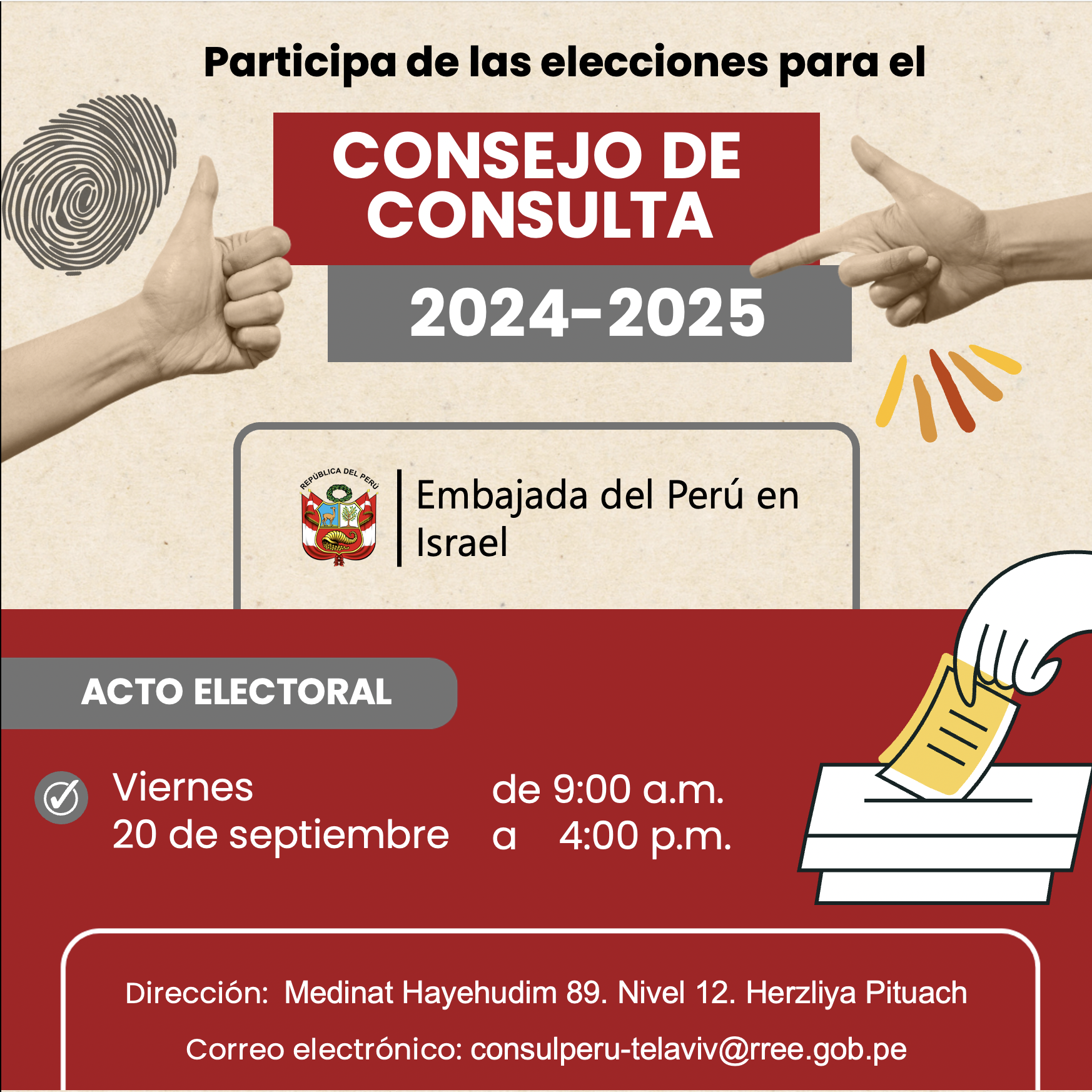 Se hace de conocimiento de la comunidad peruana en Israel que las elecciones para tres miembros del Consejo de Consulta se realizarán el viernes 20 de septiembre de 2024 de 09:00 a 16:00 horas en el local de la Embajada de Perú en Israel: Medinat Hayehudim 89, Herzliya.